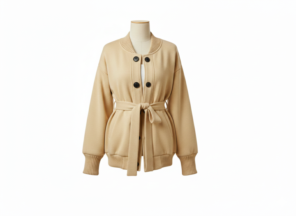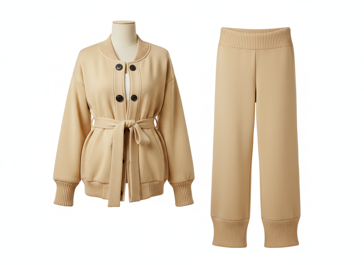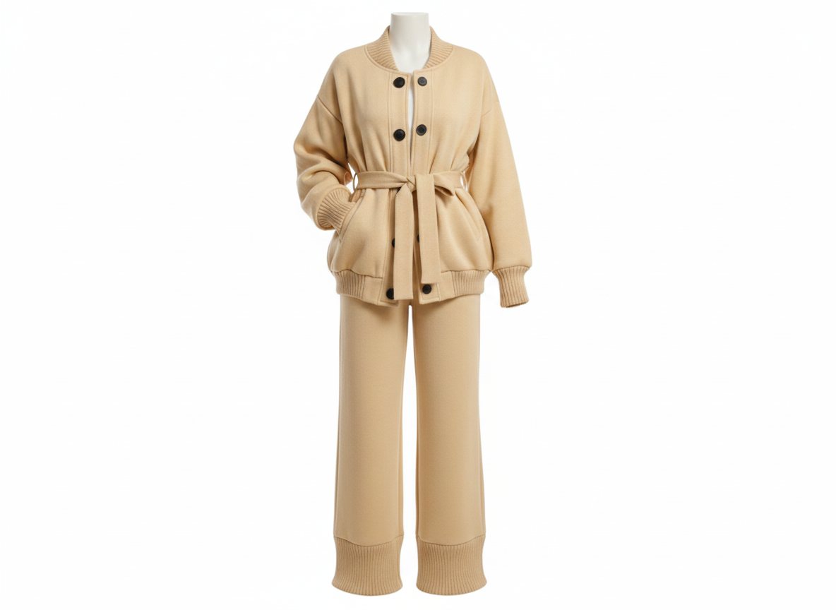 The top features a relaxed cardigan-style jacket with big buttons, ribbed cuffs, and a matching belt that lets you shape your waist the way you like. Paired with wide-leg knit pants, the whole look feels put-together yet super cozy — exactly what Kayoo stands for.